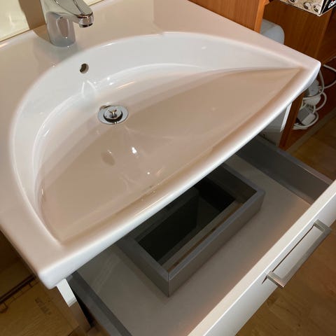 Tvättställ med underskåp i vitt. Inkluderar en handfat med blandare och ett underskåp med förvaringsutrymme. Skåpet har en låda med delad inredning för organisering.