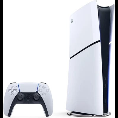 Sony PlayStation 5 Digital Edition i stilren vit design med svarta detaljer. En kraftfull spelkonsol utvecklad för spel och underhållning på PlayStation-plattformen, med snabb prestanda och imponerande grafik.