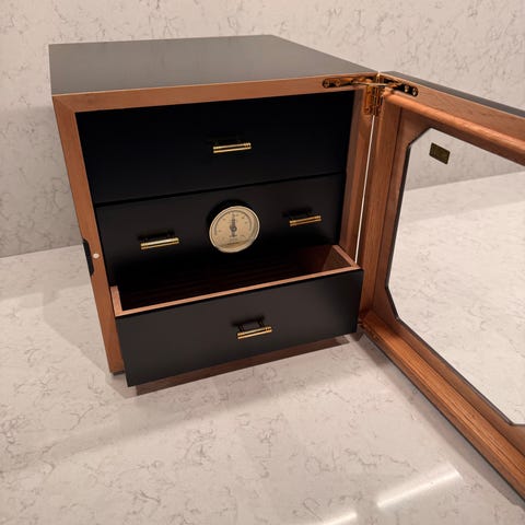 Det ingår även två elektroniska luftfuktare, modell Cigarr Oasis Plus 3.0. Fukt frigörs bara när fläkten är igång, vilket minimerar risken för överfuktning vilket annars är vanligt på elektroniska fuktare. Fläkten gör också att luften cirkulerar även i större humidorer vilket ger en jämnare fuktighet bland alla cigarrer. Vattenkassetten är väl tilltagen och behöver generellt fyllas på var 2-4 månad. Fuktarna är utrustade med en upplyst display där man enkelt kan se sina inställningar och värden.
