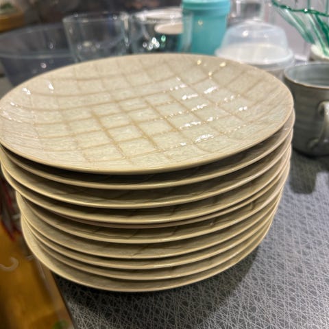 IKEA tallrikar med matt yta i ljusgrå färg. Setet innehåller flera tallrikar i olika storlekar, lämpliga för vardagligt bruk i köket.