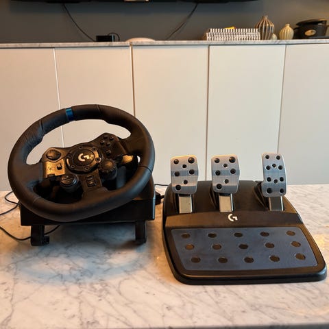 Logitech G29 racinghjul med tillhörande pedaler och växelspak. Utrustat med ratt, tre pedaler för gas, broms och koppling samt en separat växelspak. Används för simulering av bilkörning i spel och erbjuder realistisk kontroll och feedback. Den funkar helt perfekt och den har inga synliga skador.