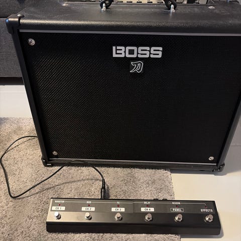 Förstärkartopp från hyllade Boss Katana. Den levererar 100w i högtalarlåda men har även en liten inbyggd högtalare som get 30w.