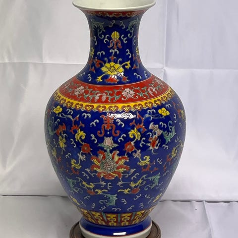 Kinesisk porslinsvas med detaljerade målade motiv i färger som guld, orange, blått och grönt. Vasens design inkluderar scener med människor och blommönster. Vasens form är cylindrisk med en bred öppning upptill och en smalare hals. Materialet är porslin och vasen har en blank glasyr. Utan skador!