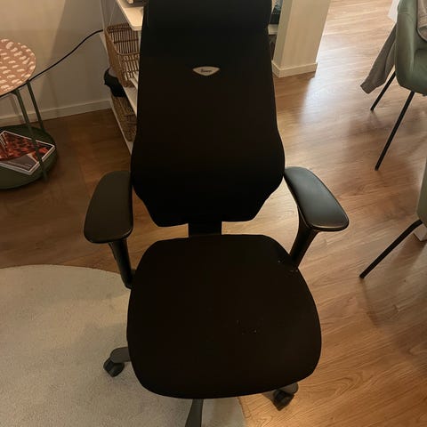 En fin mörkgrån kontorsstol från kinnarps! Knappt några defekter utom ett litet hål i tyget (se sista bilden). Ryggstödet är 47 cm högt.