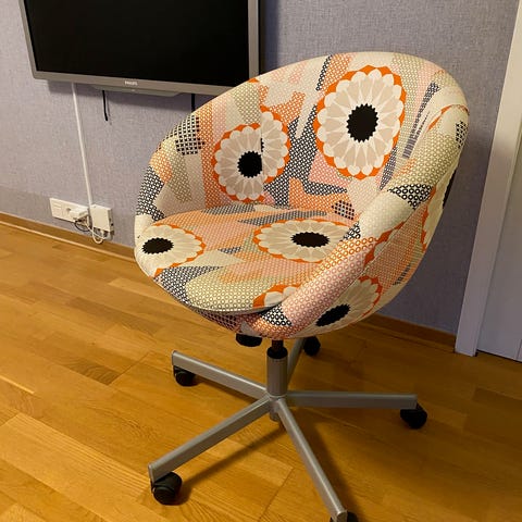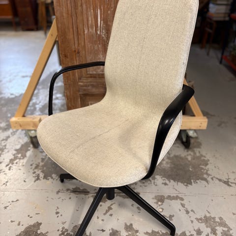 Den saknar en knapp, är lite sliten på armstöden. Se bilder.
