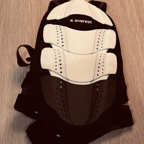 Everest ryggskydd med svart och vitt skal. Justerbara remmar för anpassad passform. Skyddar ryggen vid aktiviteter som kräver extra säkerhet.