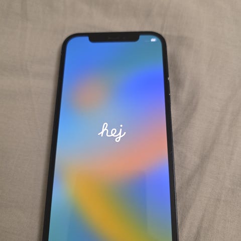 Apple iPhone 12 mini mobiltelefon med 64 GB lagringsutrymme i färgen lila. Batteriets maximala kapacitet är 79%. Enheten levereras med originalförpackning och tillbehör som laddkabel och genomskinligt skal. Små repor finns på skärmen men syns knappt vid användning.