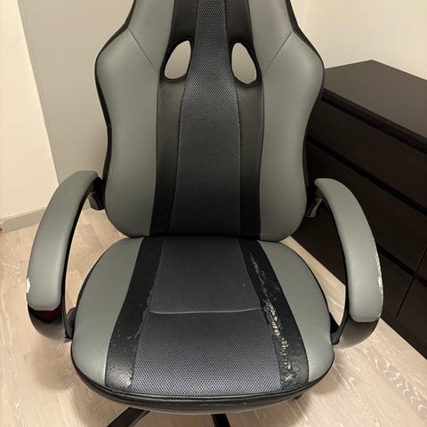 Apex Racer gamingstol. Sliten kudde (se bild) och kan behöva en liten tvätt. Gnisslar när man sätter sig men kan säkert fixas med någon slags olja. Fungerar precis som den ska och är inte trasig på nåt sätt.