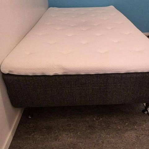 Kungsängen ramsäng med bäddmadrass och medar. Sängen är klädd i mönstrat tyg med blå och grå nyanser. Både säng och bäddmadrass är handtillverkade. Sängen är medium och i mycket gott skick, endast liten skada i tyget.