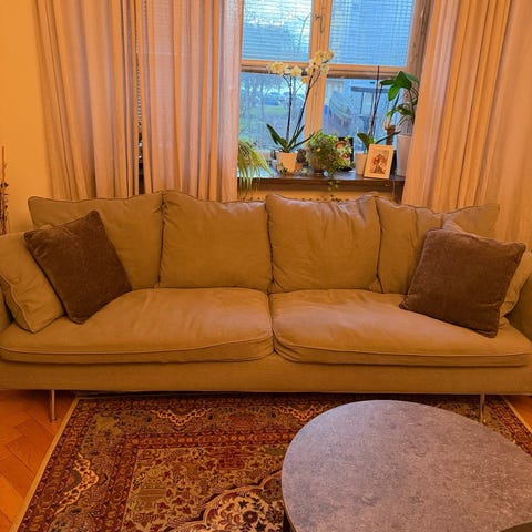 Säljer en stilren och mycket bekväm 3-sits soffa i grått tyg. Soffan är mjuk att sitta i och passar bra i både vardagsrum och TV-rum. Inga skador - i nyskick.