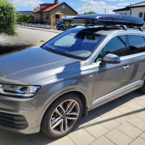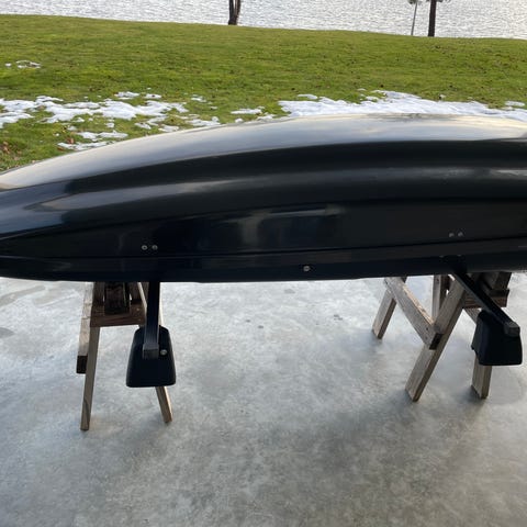 takbox i svart färg. Takboxen är designad för att monteras på takräcken och erbjuder extra förvaringsutrymme för resor och transport. Passar för olika bilmodeller med takräcken.
