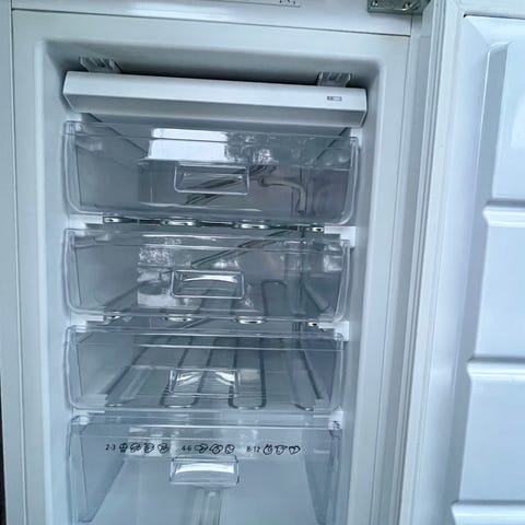 Cylinda frysskåp med flera förvaringsfack. Vit färg och vertikal design. Passar för frysning och lagring av matvaror.