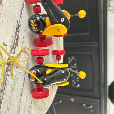BRIO Barnleksak Hund på hjul i svart och gult med röda hjul. Leksaken är avsedd för barn och kan dras i ett snöre för lek och rörelse.