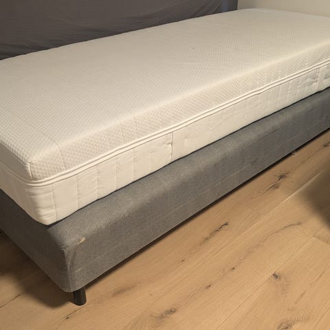 IKEA Skorva sängram med förvaring. Sängramen har en ram i metall och trälameller. Den har inbyggd förvaring under sängen som kan användas för att förvara sängkläder eller andra föremål.
