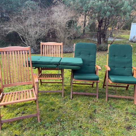 Trädgårdsmöbelset bestående av ett bord och 5 stolar i teak. Stolarna har gröna sittdynor. Bordet har med en mittdel som kan öppnas för att förlänga bordsskivan. Möblerna är anpassade för utomhusbruk.