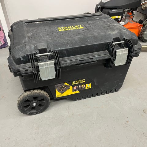 Stanley Verktygslådor Set bestående av flera lådor i svart och gul färg. Verktygslådorna har hjul och utdragbart handtag för enkel transport. Material och exakta mått är inte specificerade. Lådorna är avsedda för förvaring och organisering av verktyg och tillbehör.