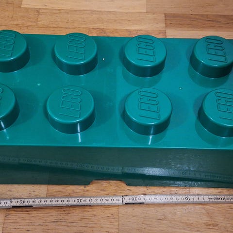 LEGO Förvaringslåda i blå färg. Tillverkad i plast med design som liknar LEGO-klossar. Används för förvaring av LEGO-bitar eller andra små föremål.