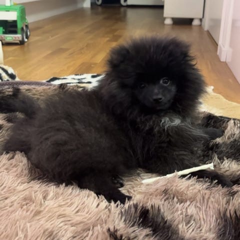 Pomeranian tik, svart/vit på halsen, 2 år gammal.