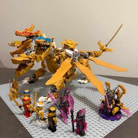 LEGO-figur med detaljerad design i orange, svart och guld.
