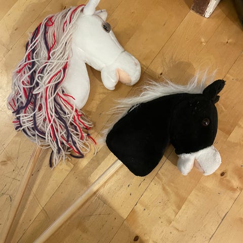 3 st käpphästar, en som kan gnägga (om du byter batterier), en som är hemmapysslad (finns några små skavanker) och en käpphästkropp att pyssla färdig själv.