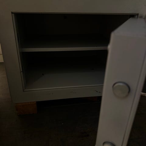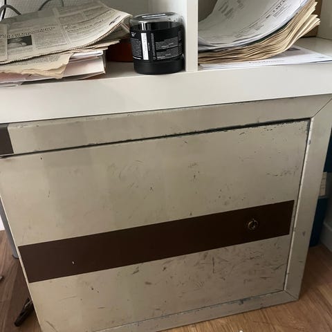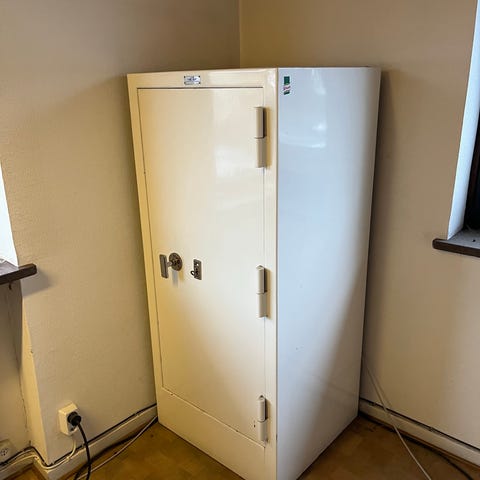 Ett kassaskåp som står på en trälåda med förvaring. Viss prutmån finns vid snabb affär. Finns utanför Emmaboda