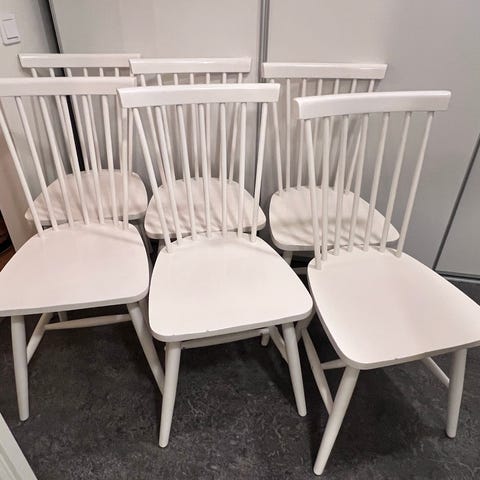 Klassiska vita pinnstolar. Bra skick men lite kantstötta. Kan behövas lite lim för ryggstödet.