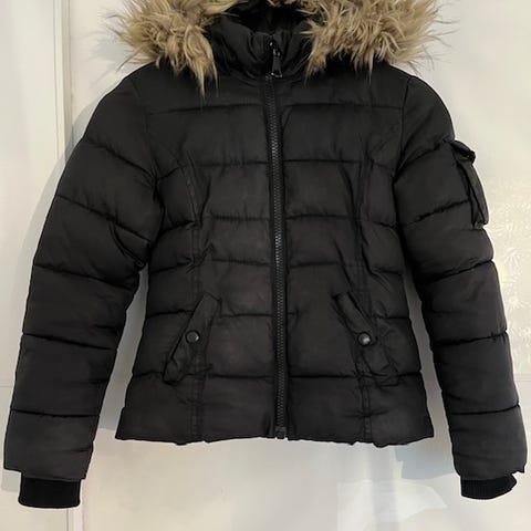 Billig vinterjacka i begagnat skick. Har fortfarande mycket att ge och värmer gott som den ska. Hängöglan har lossnat, men går enkelt att sy dit igen. Småhål baktill och blixtlåsen är lite skev men går att stänga om man drar försiktigt.