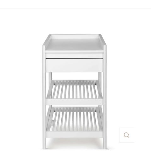 Skötbord Sundvik från IKEA, ommålat i samma grå färg som spjälsängen från Troll. Stabilt och praktiskt med bra förvaring.