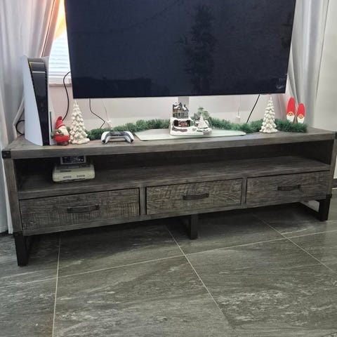 Bänken har två skåp på sidorna där man kan gömma undan massor av grejer, och i mitten finns det två snygga hyllor i glas för t.ex. spelkonsol eller digitalbox. Den känns rejäl och stabil men glashyllorna gör att den ändå ser nätt ut.