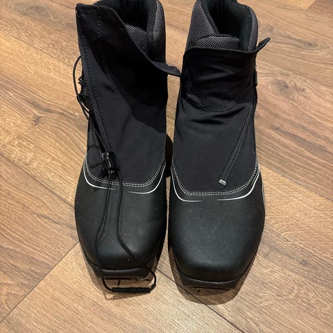 Tecno PRO Synergy Classic längdskidpjäxor i svart med röda och vita detaljer. Skorna har en robust konstruktion med snösula och är avsedda för längdskidåkning. De har en snörningslös design med dragrem bak för enkel på- och avtagning.