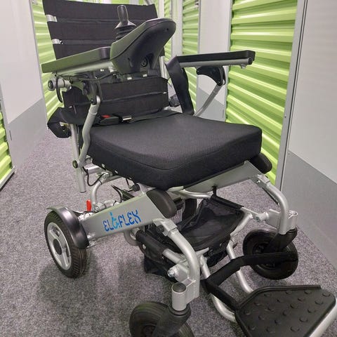 Eloflex Elektrisk rullstol med svart sittdyna och aluminiumram. Rullstolen är hopfällbar för enkel transport och förvaring, utrustad med en fotplatta och armstöd. Passar för personer med behov av elektrisk mobilitetshjälp. I nyskick då den knappt är använd. Se bilder där också beskrivning finns.