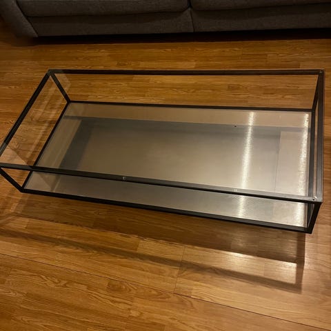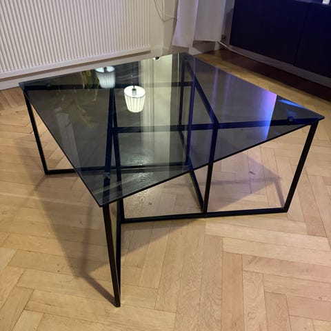 Stilrent och modernt soffbord med rund glasskiva och svart, geometriskt metallunderred köpt från Mio . Ger ett luftigt intryck och passar perfekt i både modern och minimalistisk inredning.