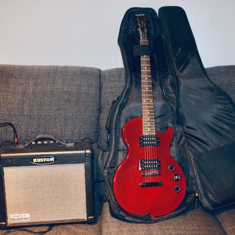 Epiphone Les Paul elgitarr i sunburst-färg. Gitarren har en solid kropp med klassisk Les Paul-design och är utrustad med två humbuckers.