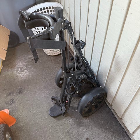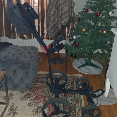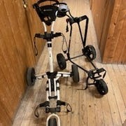 Big Max Golfvagn med tre hjul i svart färg. Konstruktionen är av metall och plast. Modellen är designad för att underlätta transport av golfbag under golfspel.