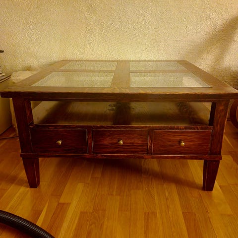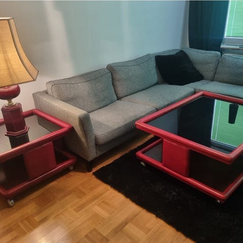 Soffbord som verkligen blir ett blickfång i vardagsrummet. Det har en stor och rejäl bordsskiva i rökfärgat glas som vilar på ett elegant underrede i mässingsfärgad metall. Riktigt 80 tals bord. Finns dock en repa i glasskivan, svårt att avgöra omfattning, görs bäst på plats.