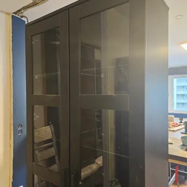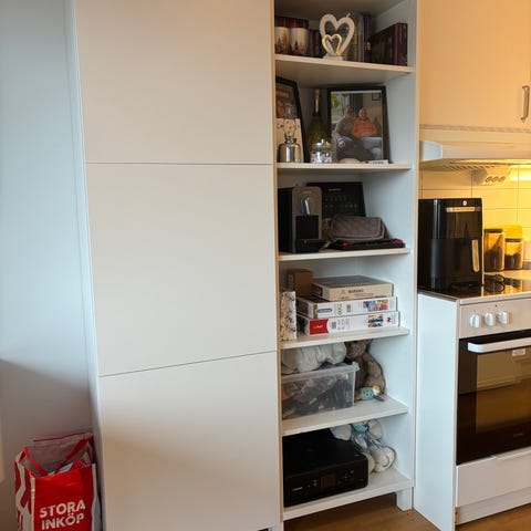 Ytterligare en hylla i liknande modell ingår. Dubbeldörrar och ett hyllplan. Ungefärliga mått höjd 85-90cm, bredd 75-80cm samt djup 35-40cm.