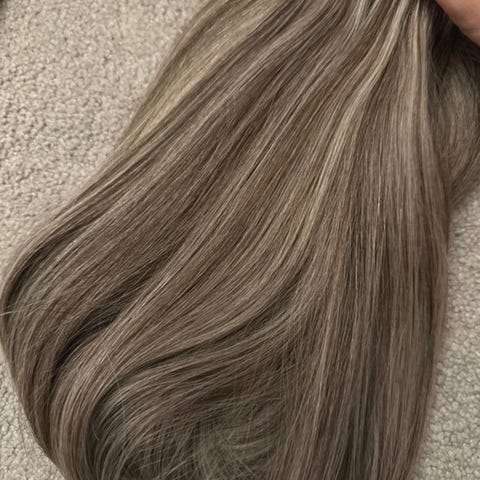 Säljer tejp hårförlängning äkta människor hår, 130g 45cm lång. 48 slingor. Pris 4500kr, Köpte på frisörsalong October Stockholm , mall of Scandinavia. Betalade 10000kr. Har använt förlängning i en månad.