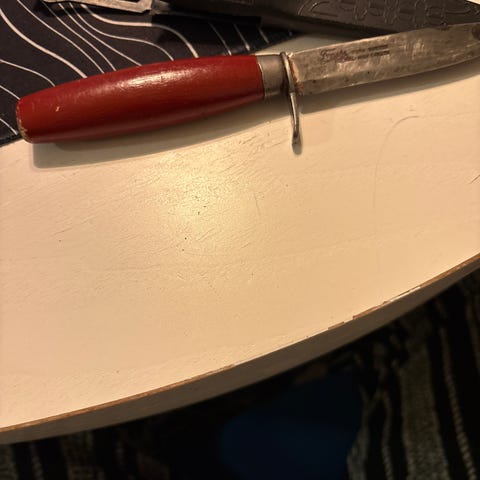 Björklösa Jonsson Mora kniv med rött handtag och läderhölster. Knivbladet är cirka 12 cm långt. Kniven är tillverkad i Sverige.