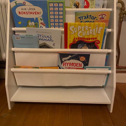 Bokhylla i trä med lutande hyllplan för förvaring och organisering av böcker. Enkelt för barnen att nå, för att hämta och ställa tillbaka. Och grymt gömställe för kurragömma 😁