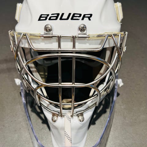 Vit Målvaktsmask CCM gf axis cce stl XL 59-63 cm med tillhörande väska med innerfack och ventilation i botten. Använd knappt en säsong. Certifikat till dec-28. Nypris ca 12000kr.