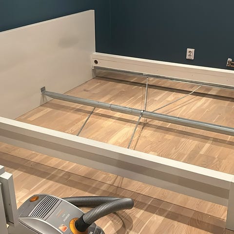 Bortskänkes - IKEA sängram med huvudgavel och sängbord i trä