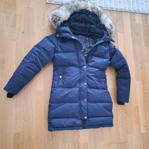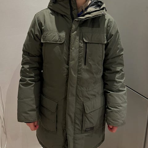 Everest Ecoya dunjacka i grön färg, storlek 34 för dam. Jackan är tillverkad med dun som isoleringsmaterial och har en design anpassad för ytterkläder. Den är utrustad med huva och flera fickor, lämplig för kallare väderförhållanden.