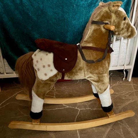 Gunghäst i mjukt klappvänligt tyg söker nytt barn att leka med. Skrapmärken i färgen på medarna, i övrigt bra skick.