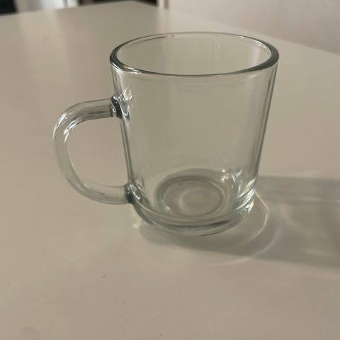 IKEA glas kaffekopp i klart glas. Koppen är tillverkad av transparent glas och har en enkel design med handtag. Passar för servering av kaffe eller andra varma drycker.