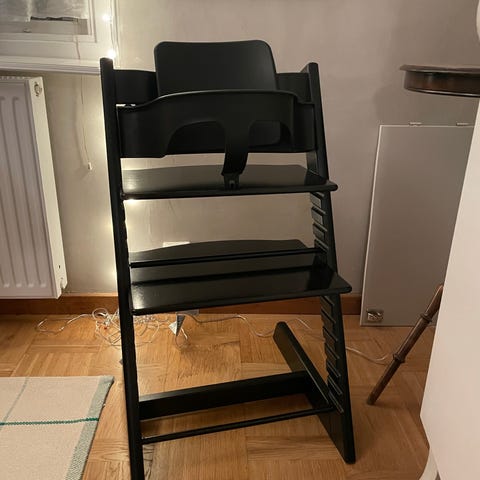 Tillbehör i vitt till Stokke Tripp Trapp barnstol, bestående av "Baby Set" (V2) och bricka.