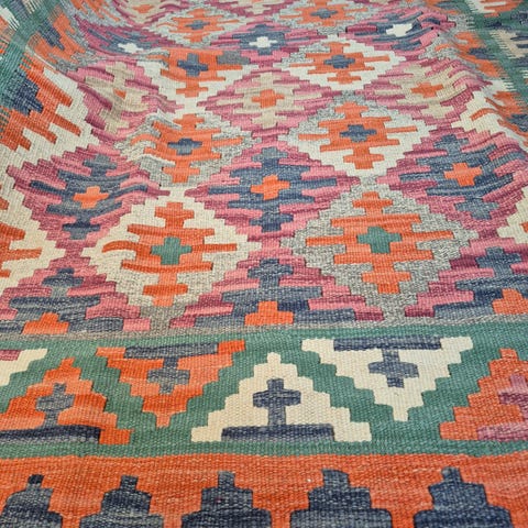 &Tradition Handvävd Persisk Kelim Matta med mönster i flera färger, inklusive blå, röd, orange och beige. Mattan är handvävd och har ett traditionellt persiskt kelimdesign. Passar som golvmatta för olika rum.