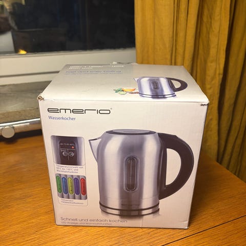 Emerio vattenkokare i svart färg. Utrustad med vattennivåindikator och inbyggd värmeelement. Passar för uppvärmning av vatten i hushåll.
