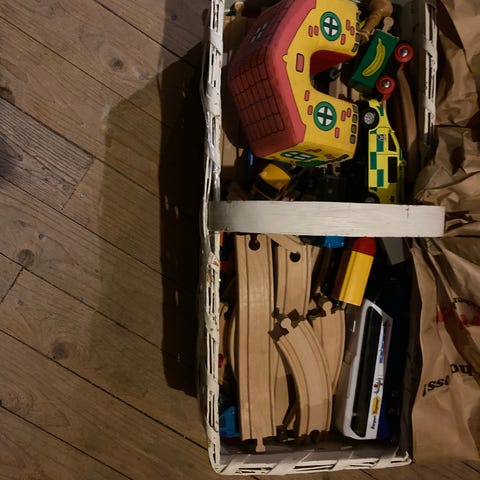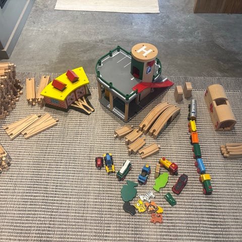 BRIO tågbana i trä med flera spårdelar, röd bro, grön bro, tunnlar, station och perrong med tak och parkering. Träd, hus och en älg. Flera tågset, vissa med batteri som skapar ljus och ljud. Ett lok har drivning på hjulen (ej fungerande batteri). Några enstaka delar av märket MICKI.