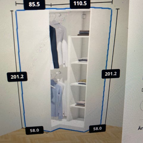Invändiga bilder bifogade visar hyllplan, hängstång och extra förvaring – allt intakt, rent och i bra skick.