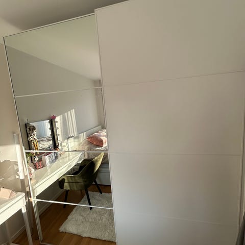 IKEA PAX-garderob med skjutdörrar i spegelglas och vit ram.
